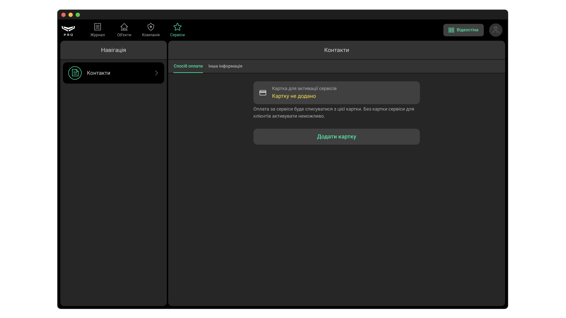 Власник компанії або старший менеджер сервісів Ajax має додати платіжну картку для оплати. Для цього в застосунку Ajax PRO Desktop:
