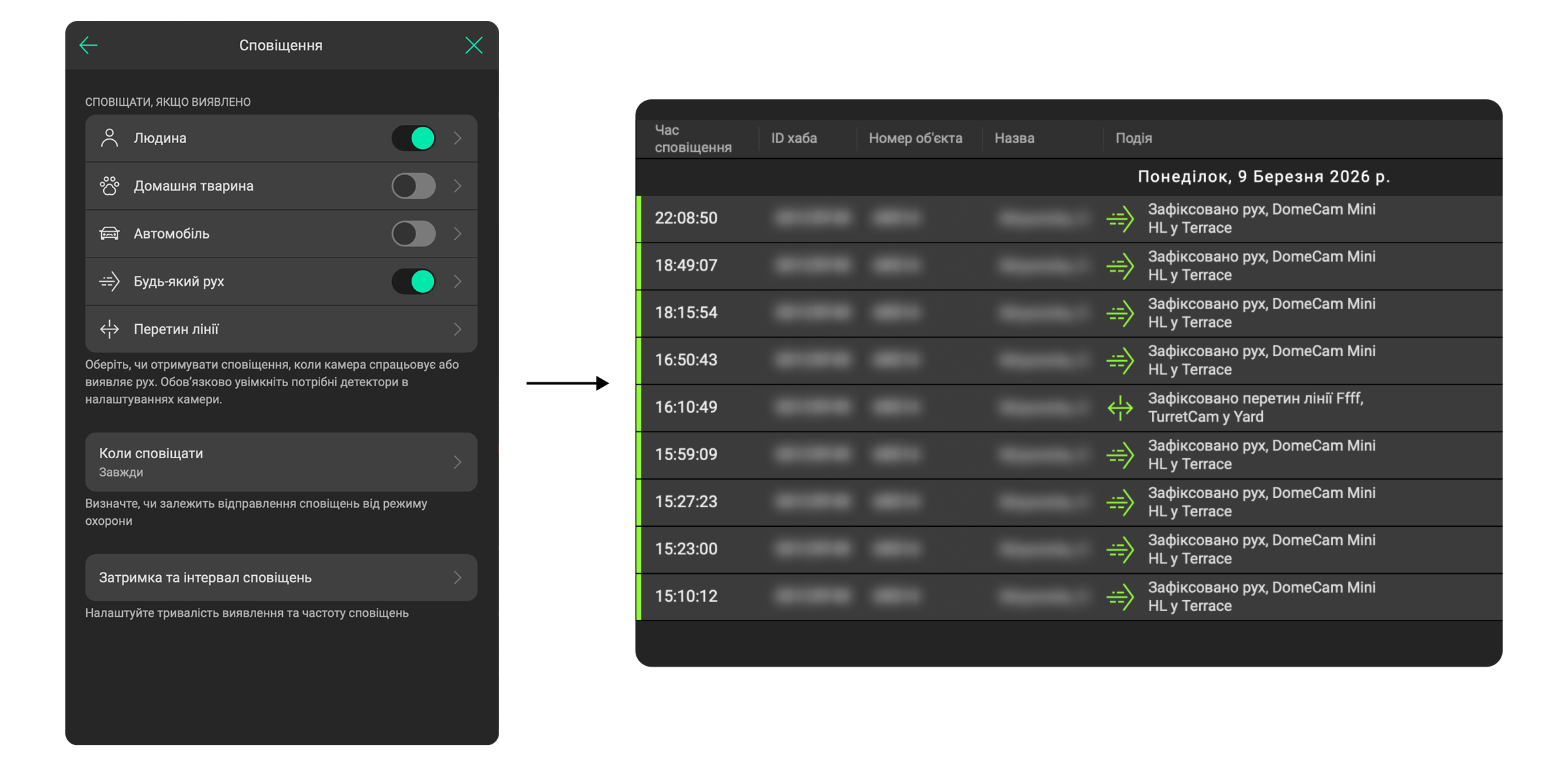 - Виберіть тип обʼєкта або руху, у разі виявлення якого буде надіслано сповіщення. Зверніть увагу, що виявлення відповідних типів обʼєктів або руху має бути ввімкнено в налаштуваннях Детекція.