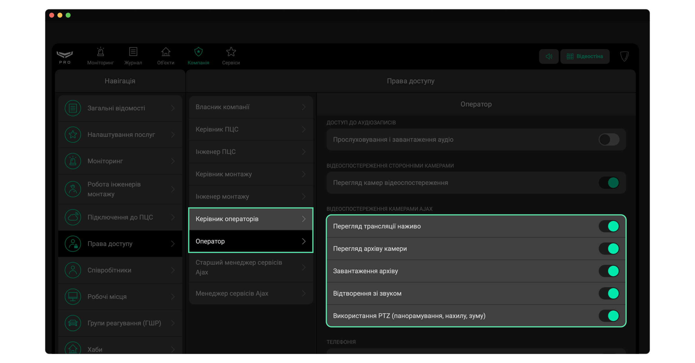 Переконайтеся, що оператори мають доступ до трансляції та архівів, якщо вибрано опцію Посилання для перегляду в PRO Desktop. Для цього:
