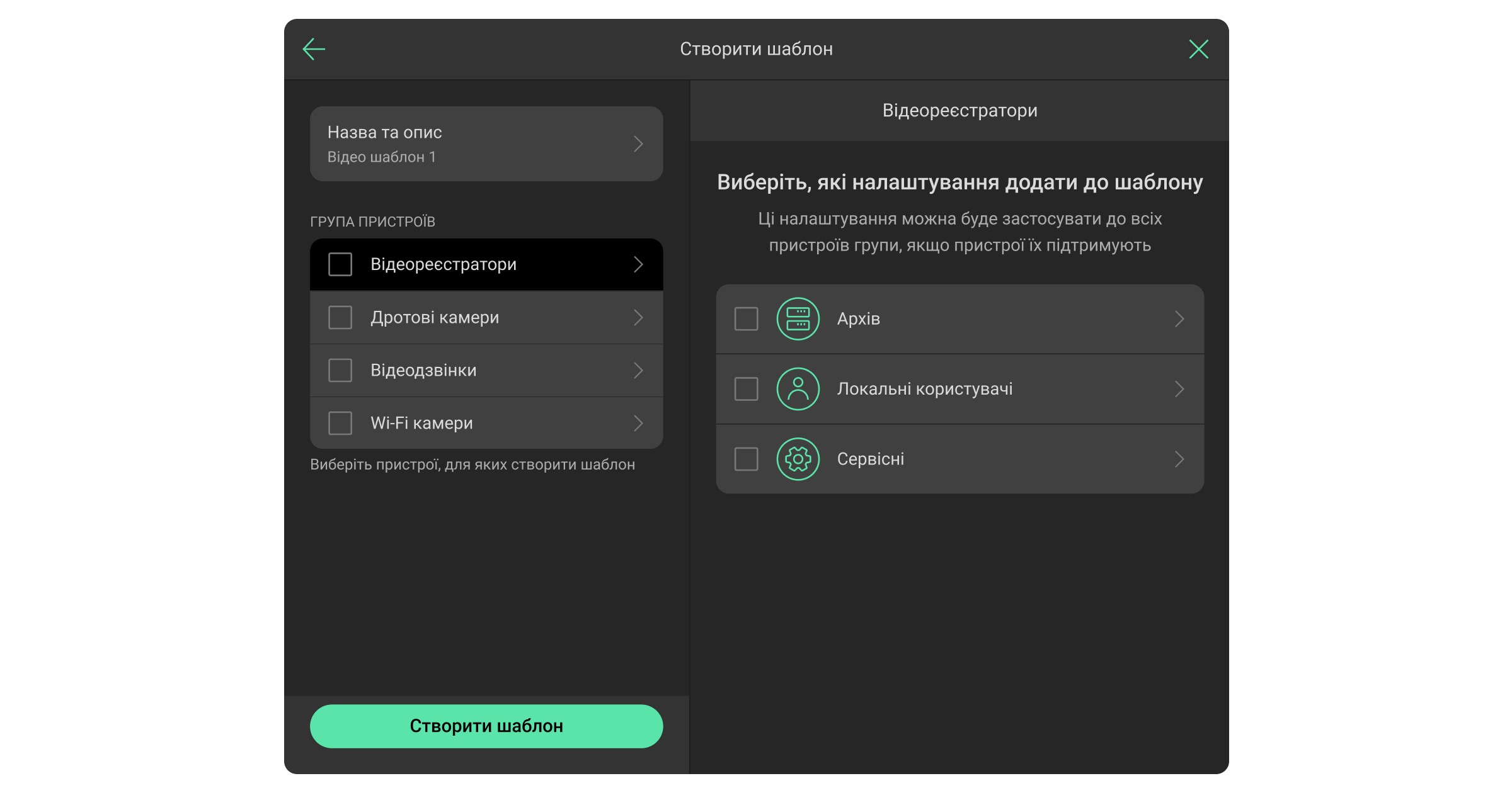 - Виберіть групи пристроїв, для яких ви хочете створити шаблон: Відеореєстратори, Дротові камери, Відеодзвінки та Wi-Fi камери.