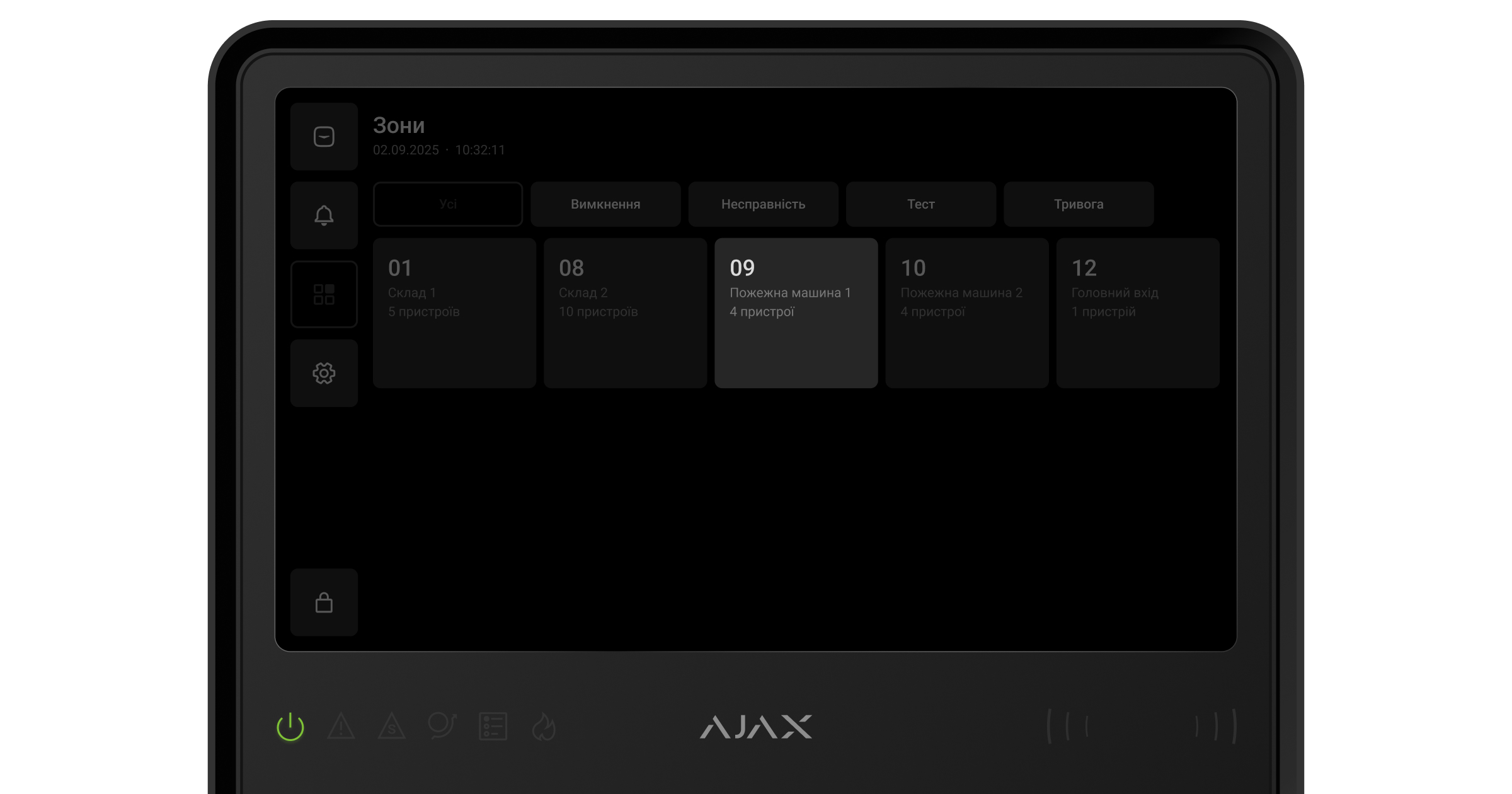 Адміністратор або користувач із рівнем доступу 2 може запускати Тест зони безпосередньо із сенсорного екрана приладу приймально-контрольного пожежного (ППКП) або в застосунках Ajax таких або новіших версій: