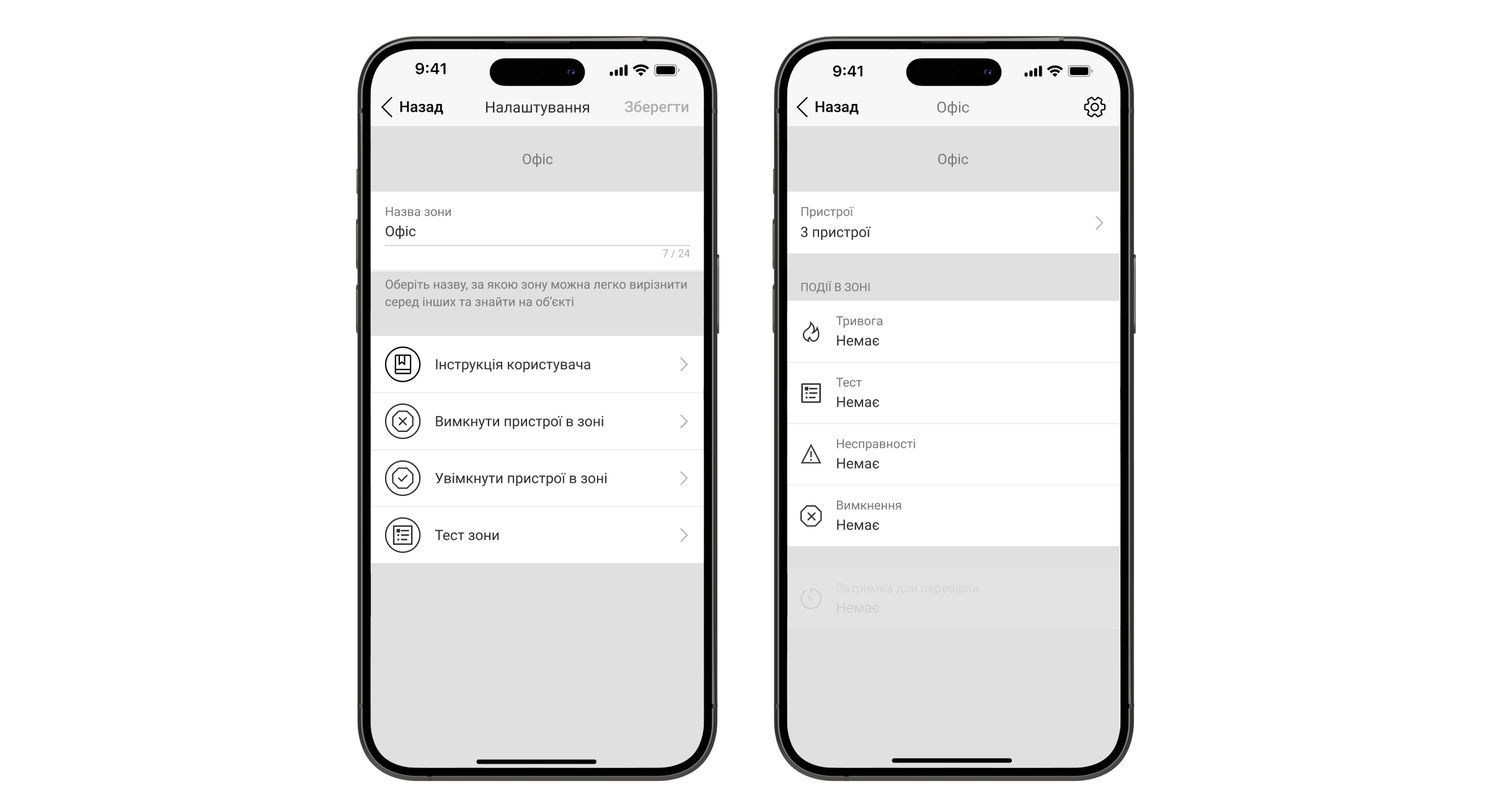 - Перейдіть до налаштувань зони на екрані ППКП або в застосунку Ajax.