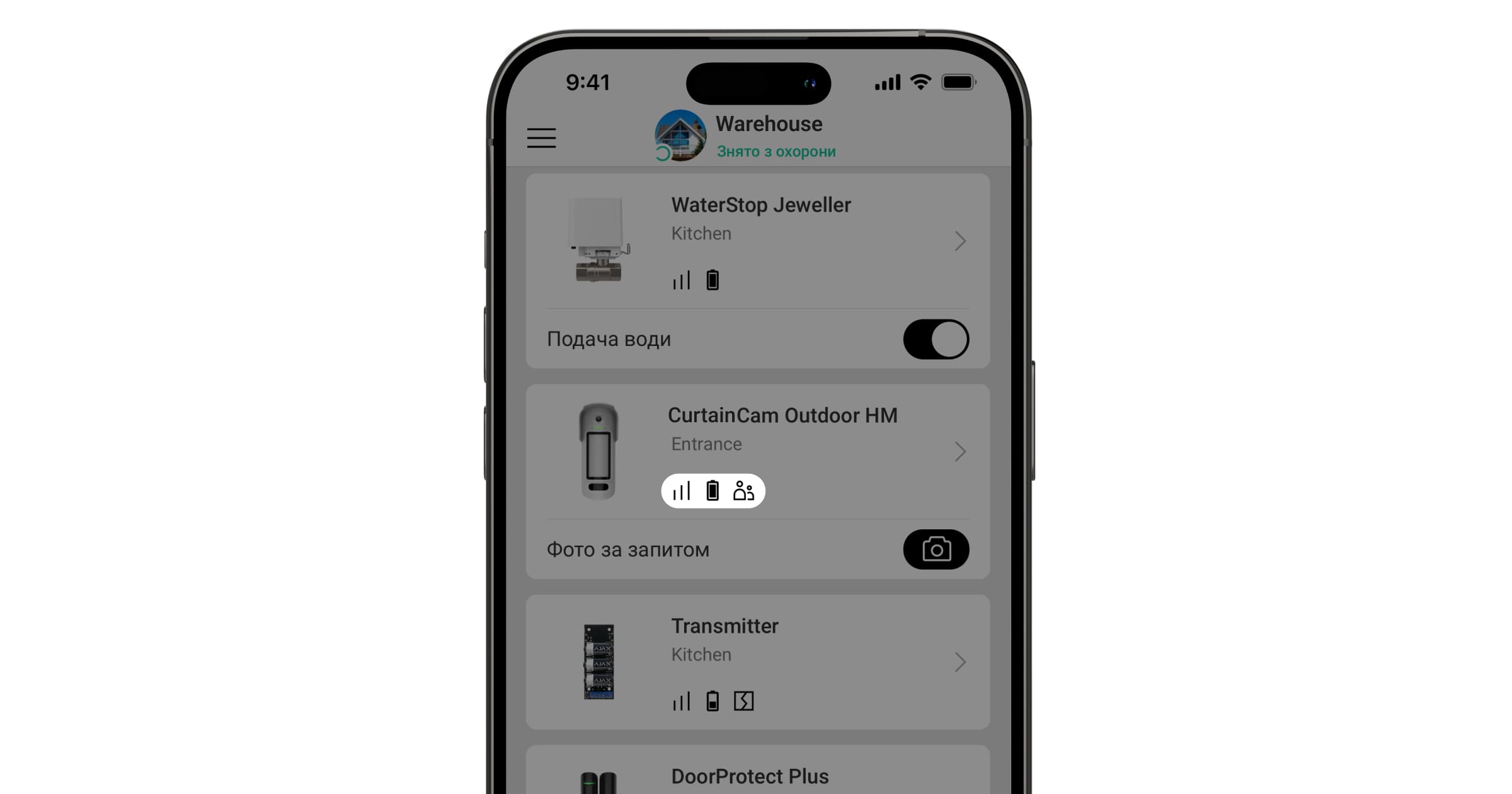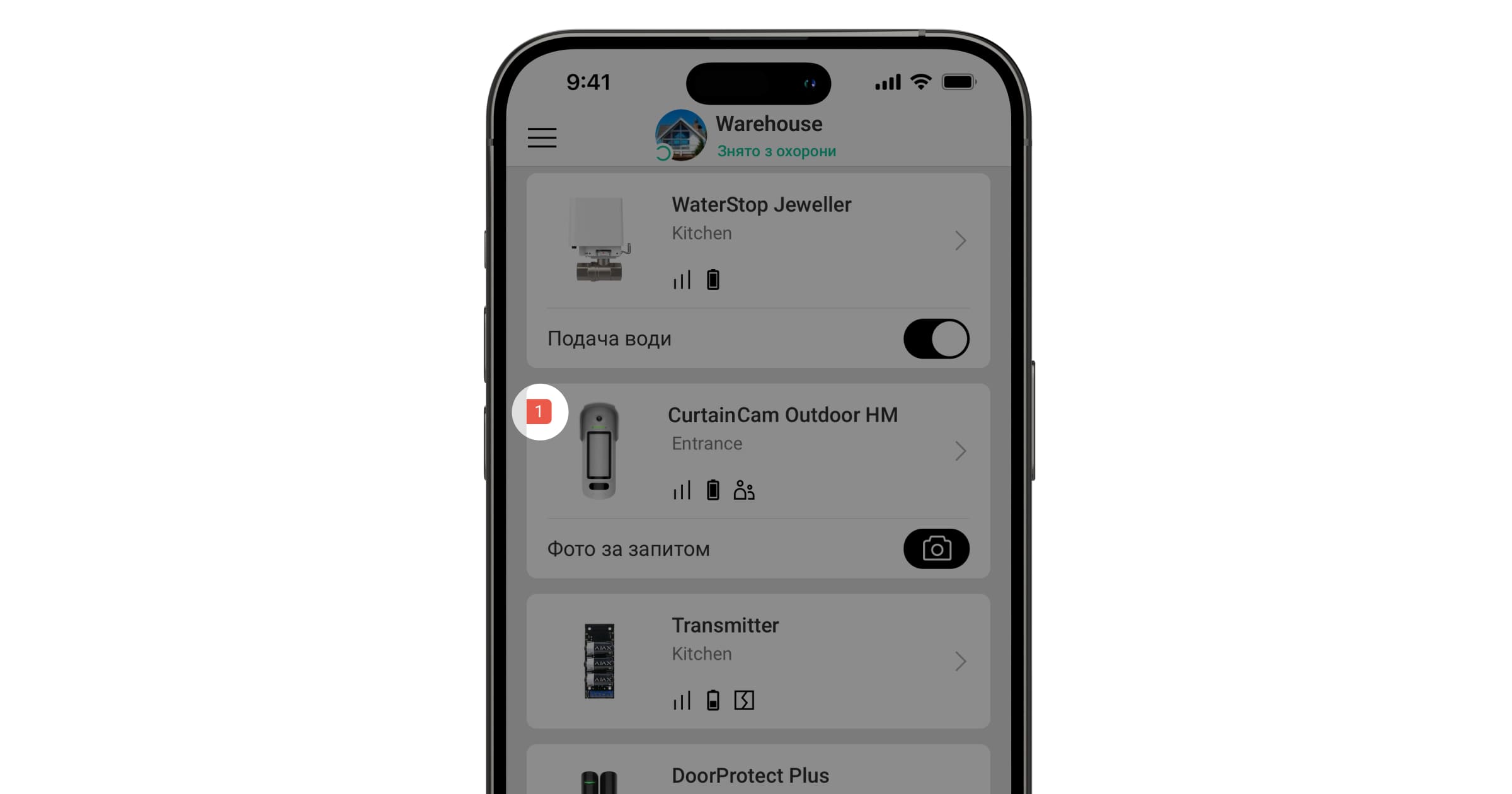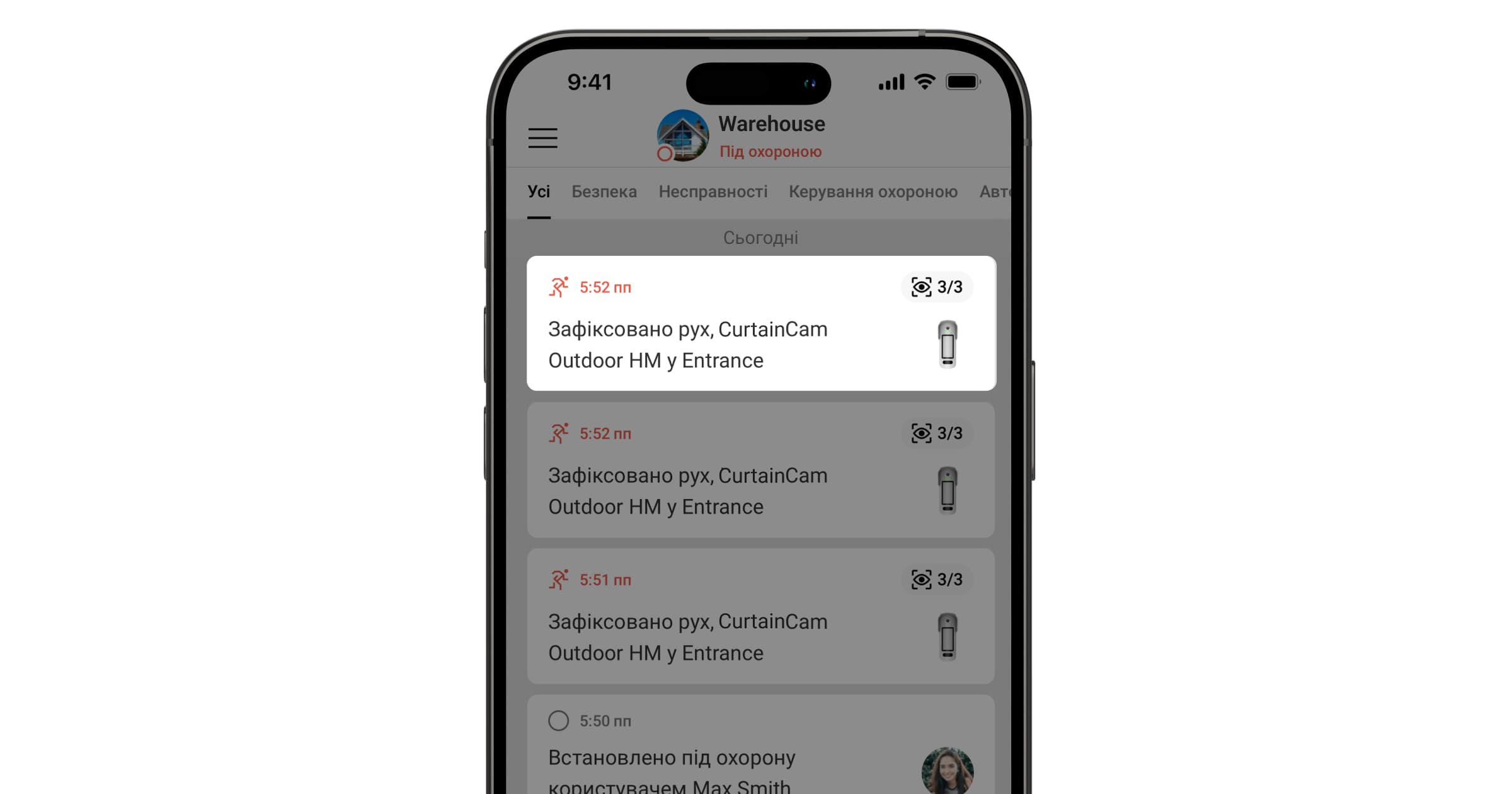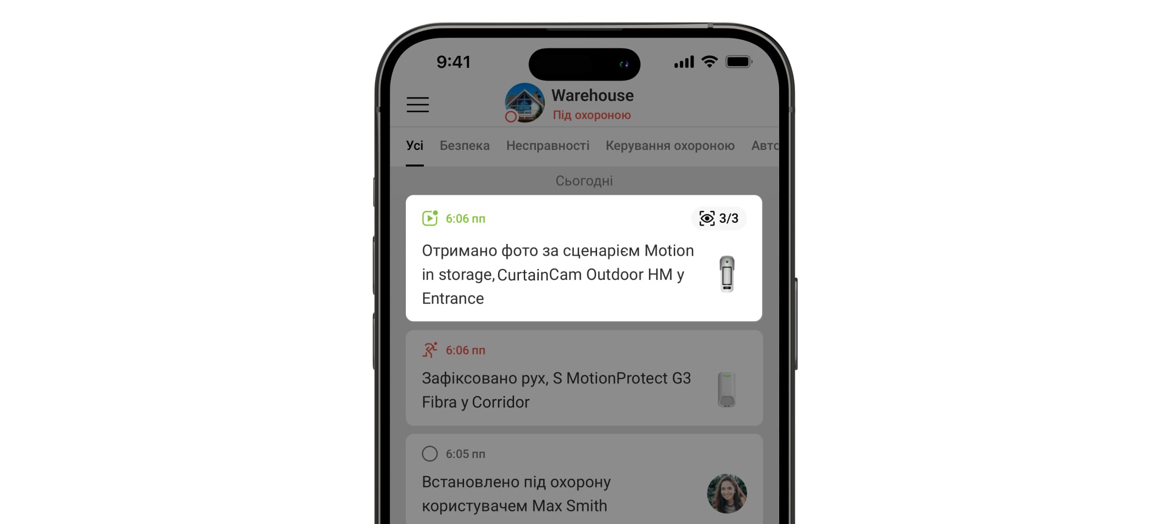 Користувачі й охоронна компанія точно знають, де саме датчик виявив рух. Сповіщення містять ім’я простору (назву об’єкта під охороною), назву пристрою та віртуальну кімнату, до якої приписано датчик.
