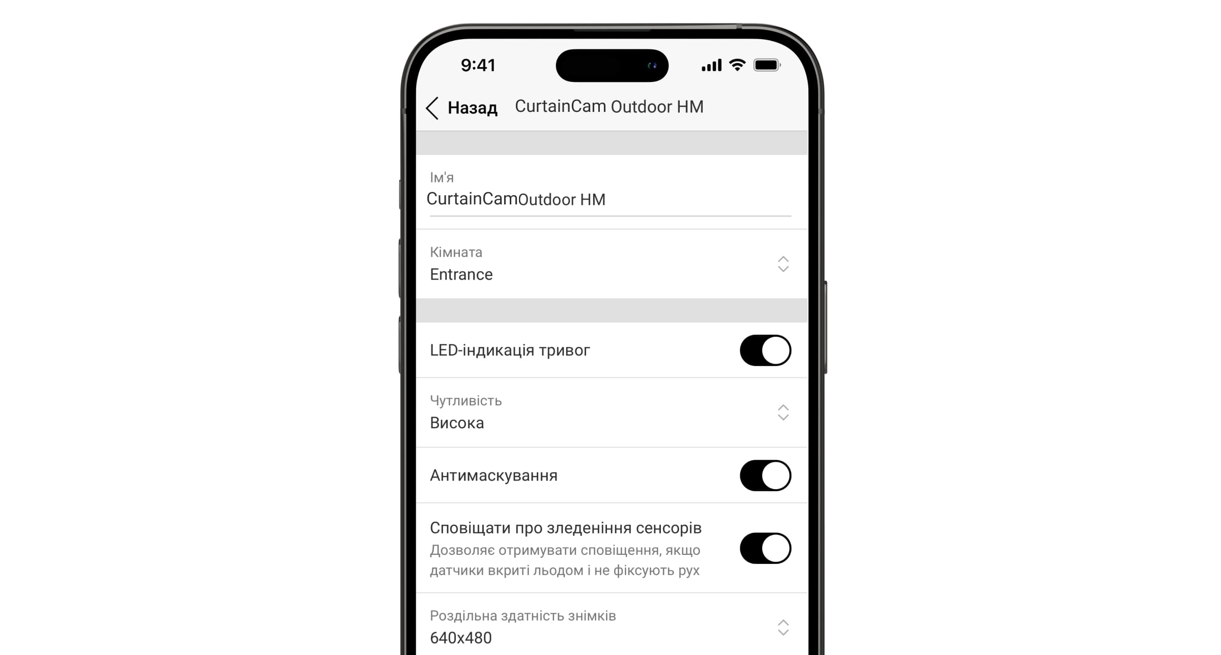 Опція Робити фото, якщо виявлено маскування дає змогу користувачам отримувати фото з вбудованої камери в разі виявлення маскування. Опцію ввімкнено за початкових налаштувань. Роздільна здатність і кількість знімків залежать від налаштувань функції Фото за тривогою. Фото за маскуванням доступні всім користувачам, які мають доступ до перегляду стрічки подій. Якщо опцію ввімкнено, пристрій робитиме фото за маскуванням незалежно від режиму охорони.
