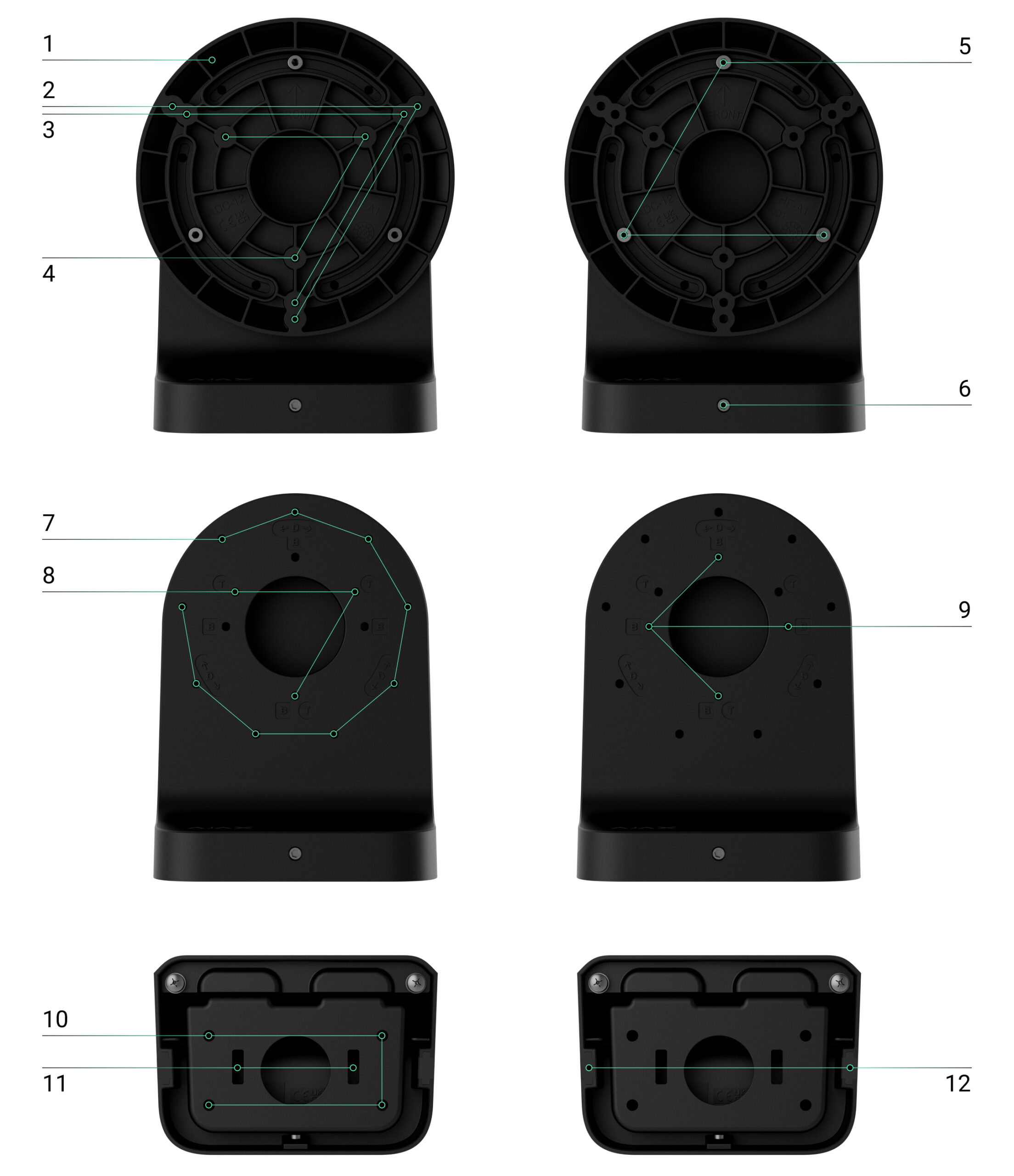 - Отвори для кріплення камер TurretCam або TurretCam HL до корпусу MountCam.