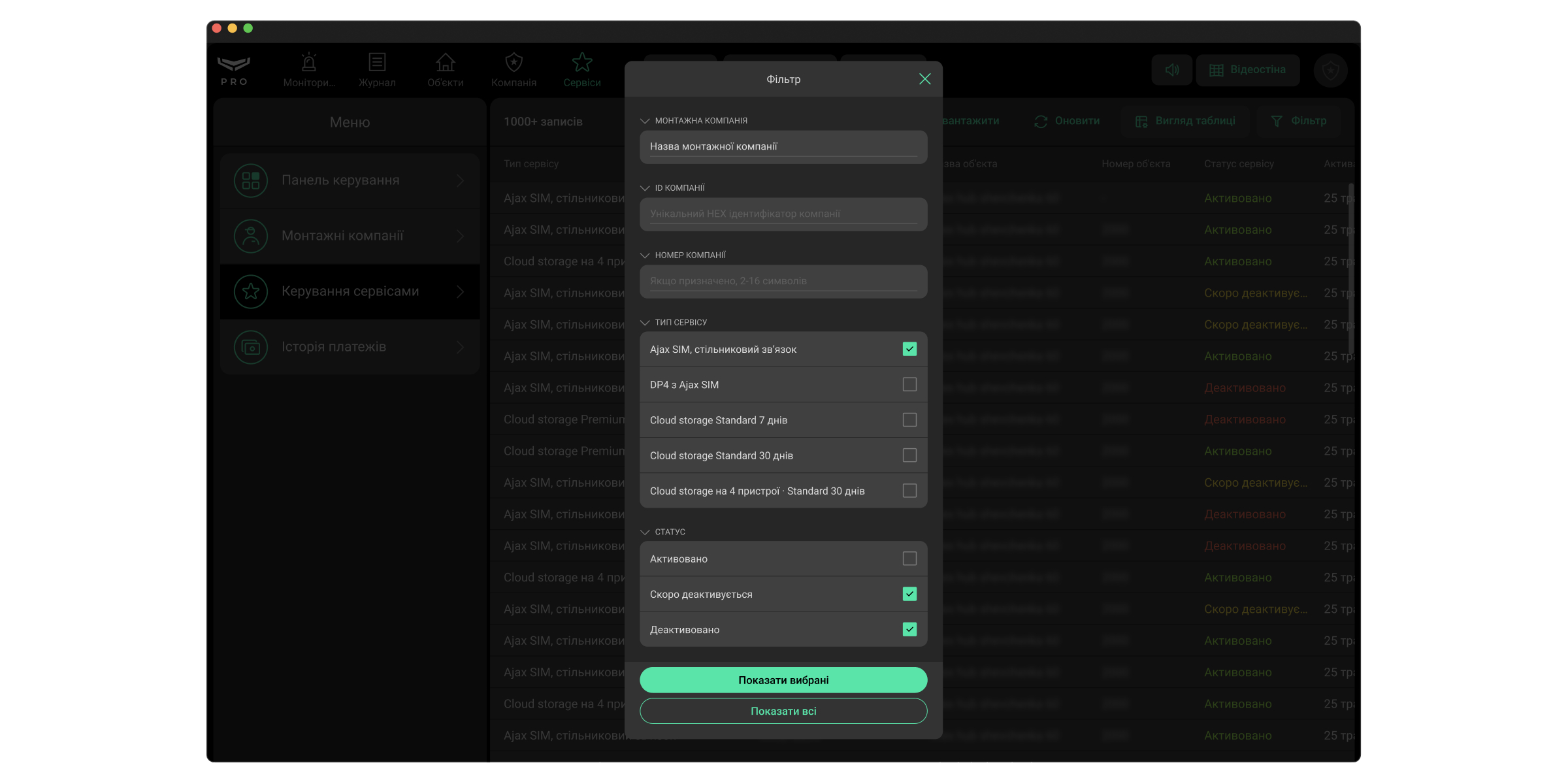 Інженери монтажу та менеджери сервісів компанії-дилера можуть керувати Сервісами Ajax: активувати чи деактивувати їх, а також призупиняти чи відновлювати їхнє надання. Сервіси Ajax можна активувати у застосунках Ajax PRO (для інженерів монтажу) і PRO Desktop (для інженерів монтажу та менеджерів сервісів).