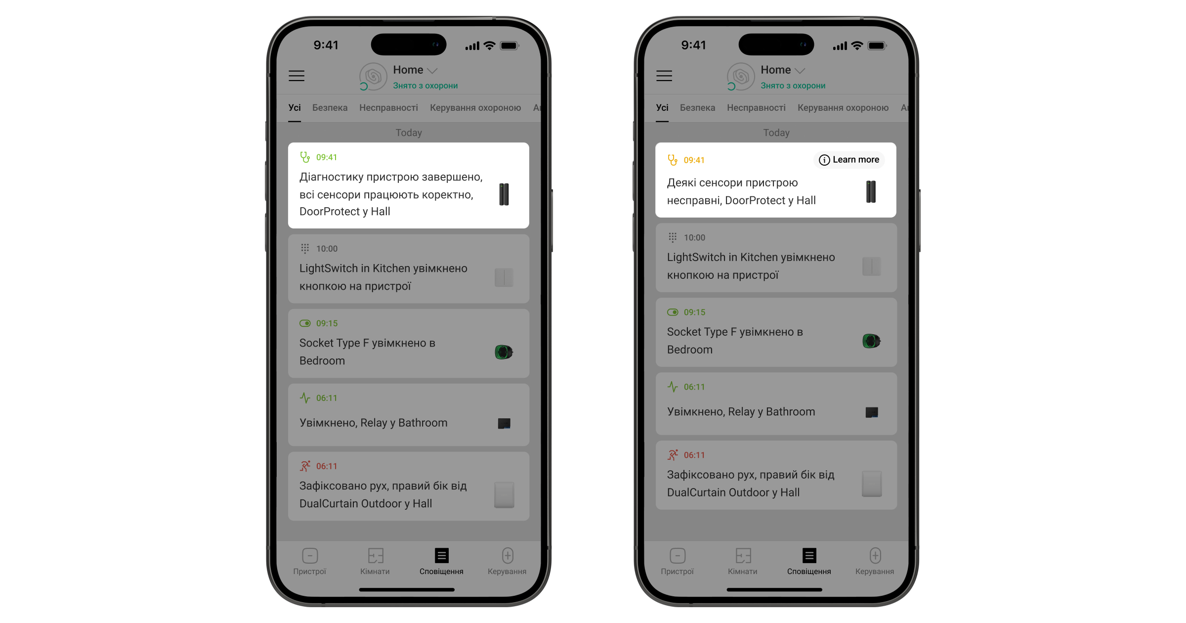 Сповіщення налаштовуються у два етапи: перший — налаштування сирен, другий — налаштування датчиків відчинення.