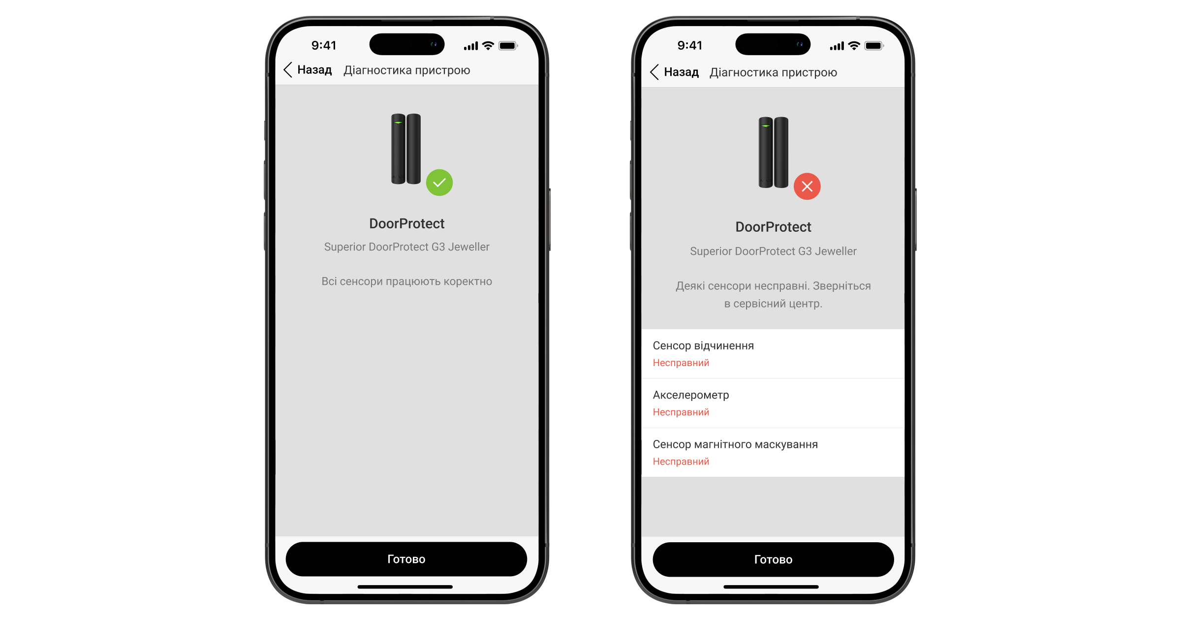 Діагностика пристрою дає змогу перевірити, чи коректно працюють усі вбудовані сенсори датчика. Під час тестування система перевіряє сенсор відчинення, акселерометр, а також сенсор магнітного маскування.