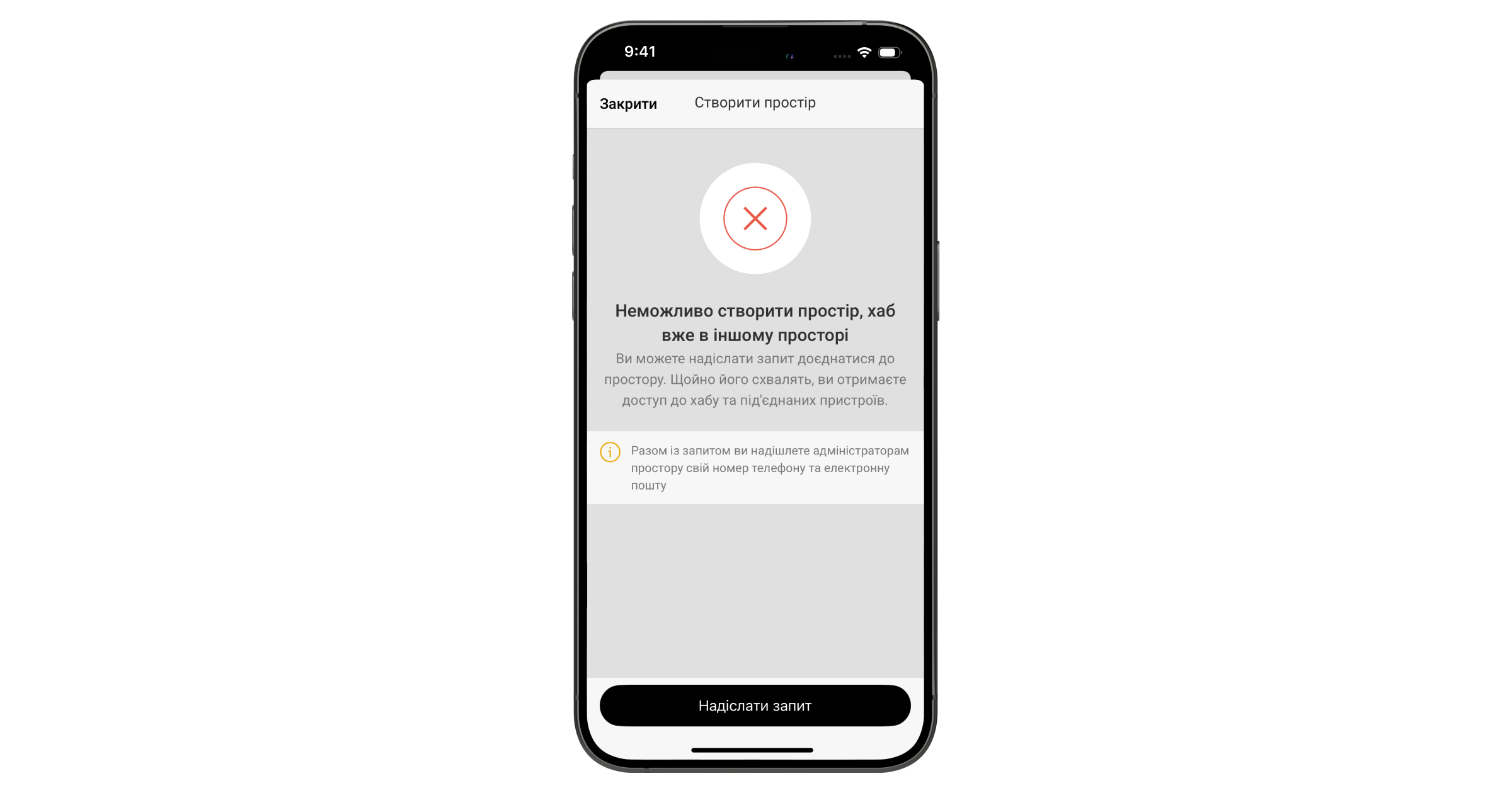 Якщо на хабі вже є користувачі, додати ваш обліковий запис на нього може адміністратор хаба, PRO з правами налаштування системи або монтажна компанія, яка обслуговує цей хаб. Ви отримаєте сповіщення про те, що хаб додано до іншого облікового запису. Щоб дізнатися, кому належать права адміністратора на хабі, зверніться до служби технічної підтримки Ajax.
