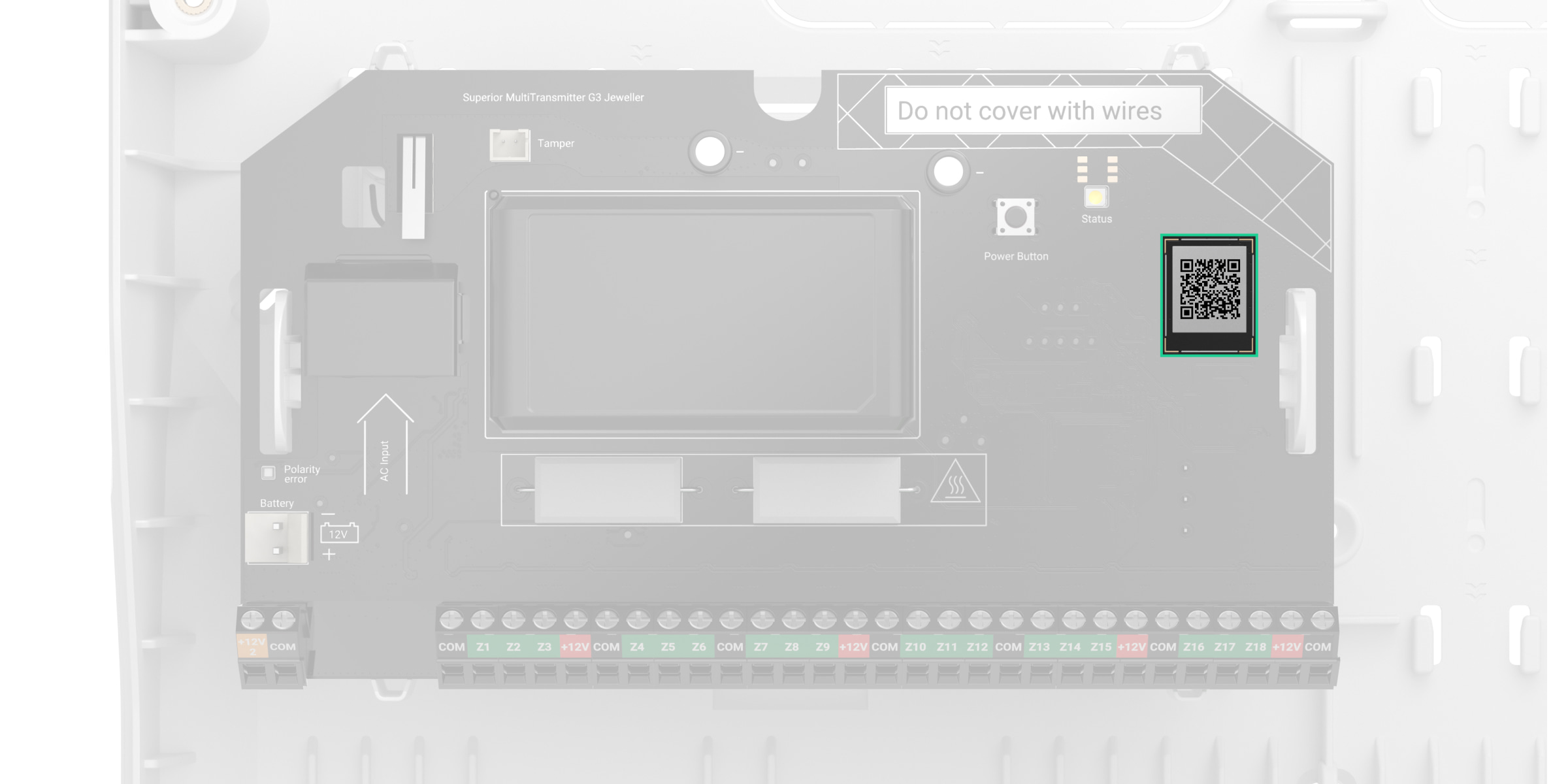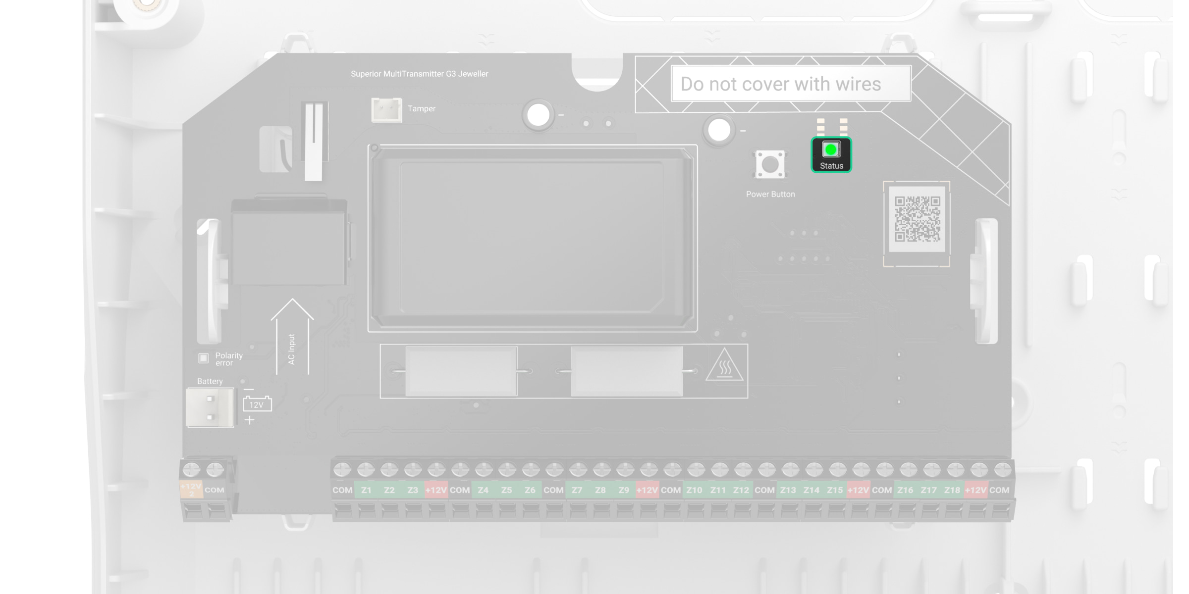 Superior MultiTransmitter G3 Jeweller (without casing) має роз’єм для кріплення тамперної плати до модуля в разі встановлення в Ajax Case, щоб захистити корпус від демонтажу. На передній і задній сторонах плати розміщено дві кнопки тампера. Зауважте, що в поточній версії модуля вони наразі не використовуються. Пристрій Superior MultiTransmitter G3 Jeweller (without casing) живиться від мережі 100–240 В~ і може працювати від резервної батареї 12 В⎓. Також модуль може забезпечувати живлення 10,5–15 В⎓ для підʼєднаних пристроїв.