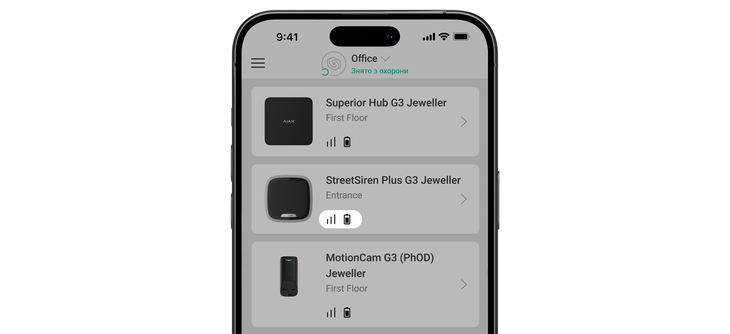 Рівень сигналу Jeweller визначається кількістю недоставлених або пошкоджених пакетів даних за певний проміжок часу. Іконка у вкладці Пристрої