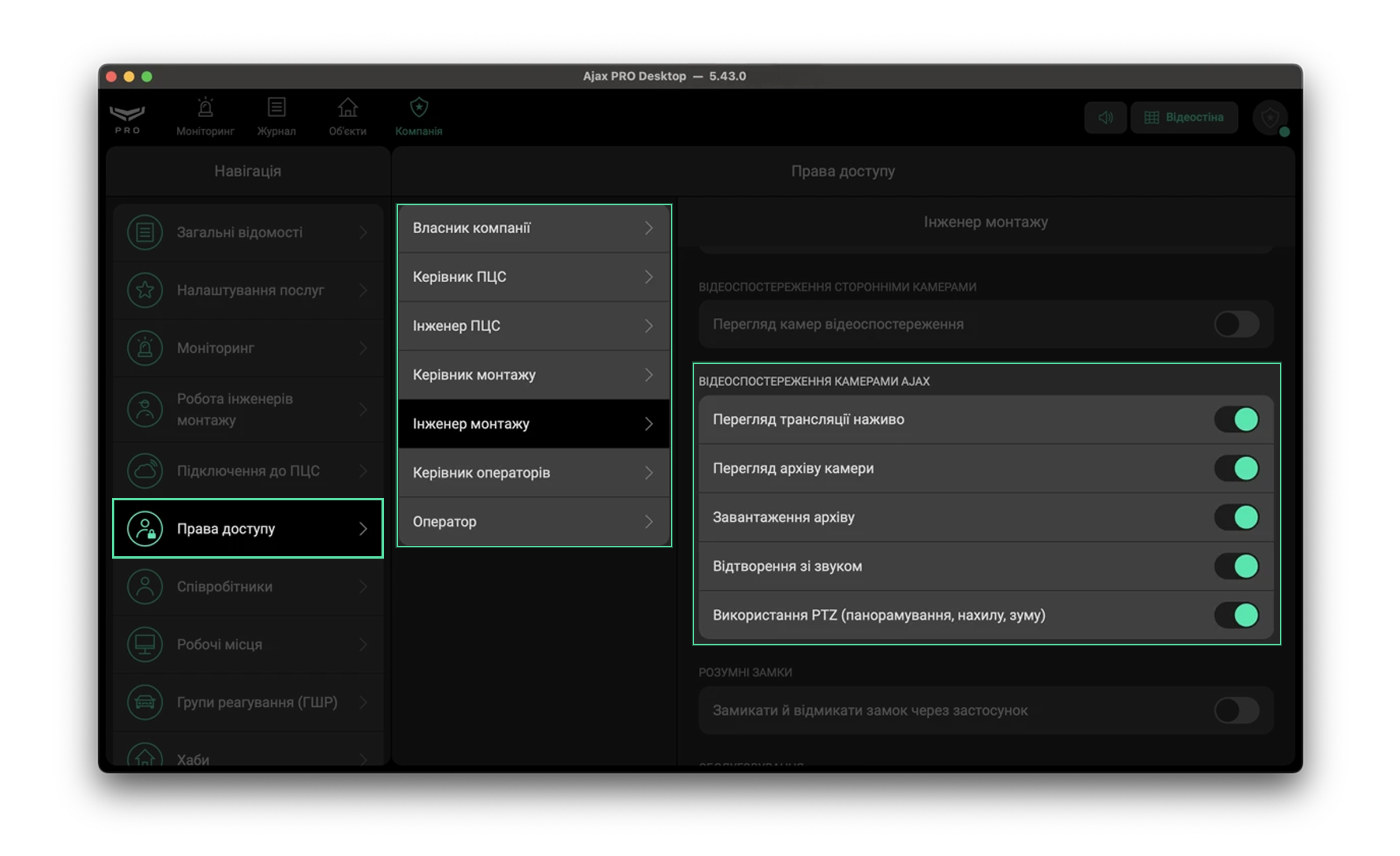Компанія може керувати дозволами співробітників у межах, визначених власником системи. Усі дії інженера монтажу фіксуються в застосунку Ajax PRO Desktop.
